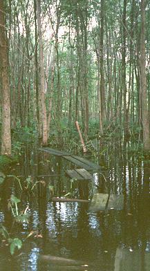 Floating bog bridges in the Vernie Swamp, NJ. When stepping on these bridges we would sink knee deep in swamp water.